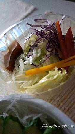 擺上清脆的小黃瓜切片 . 蘿蔔絲