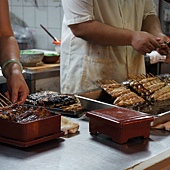蒸好的鰻魚串浸泡在醬汁裡一盤盤的端出來